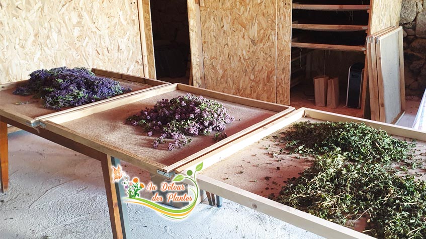 Je récolte et fais sécher mes plantes, dans des séchoirs en bois non-traité, sur des claies en toile de jute. Je les conditionne en infusion, en sachet vrac ou en boîtes de dosettes individuelles. Je les transforme en produits cosmétiques avec l’Atelier technologique du lycée agricole de St-Flour.